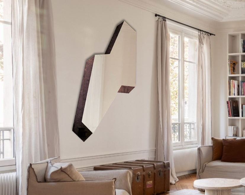 Le miroirs RUBAN #01 de Julien Le Goff s’imposent comme de véritables sculptures murales contemporaines. Inspirés de la série GRAFF, ils en prolongent l’énergie graphique tout en affirmant une monumentalité nouvelle. Ici, la géométrie devient mouvement : les segments de miroir se plient, se croisent et se décalent, formant une composition fluide qui capte la lumière et redéfinit l’espace.